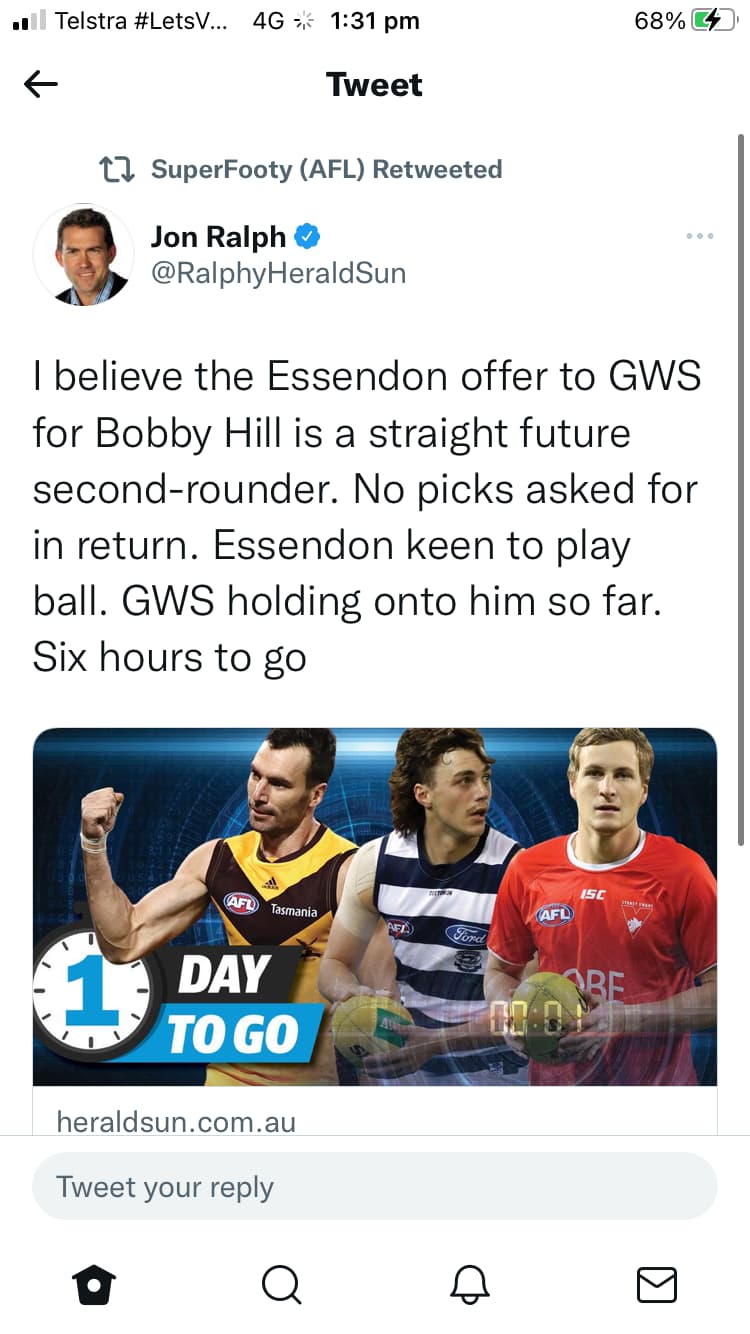Could happen but if I were to guess then it would be more likely to happen on draft night when the club has a clearer picture of who might be available. Would take a good offer I reckon. If you recall the video from last years draft Dudoro used all the allotted time before taking Reid. This was nothing to do with Reid, it was just that you never know what offer may come in so you have to wait. As they say everything is for sale, it is just the price that is the question.