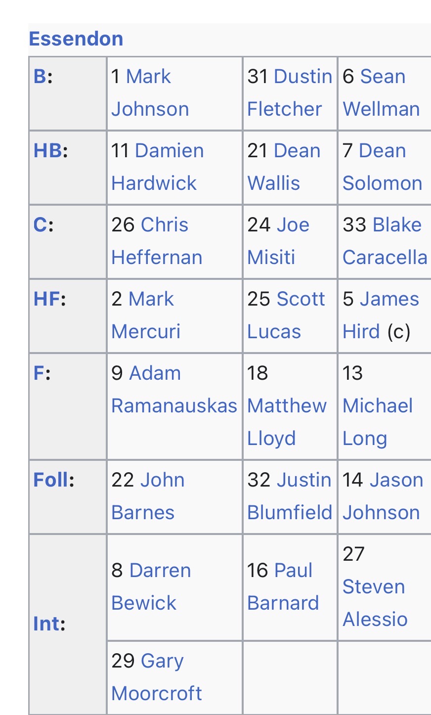 The 2001 team had a lot more “average” players and was a heatwave/lack of needles/injury to Hird away from being premiers. And some of the above (e.g. Wallis or Alessio) get the traditional tag of “good ordinary players”.