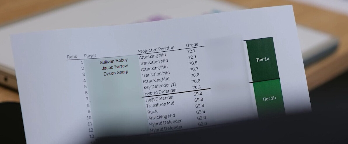 I just took a screenshot from the 33 second mark of what appears to be their player rankings. Interesting exercise would be to attempt to guess which players at which position e.g. I’d guess they have Harry Dean ranked 6th (Key Defender), and CDT (Ruck) ranked 10th!