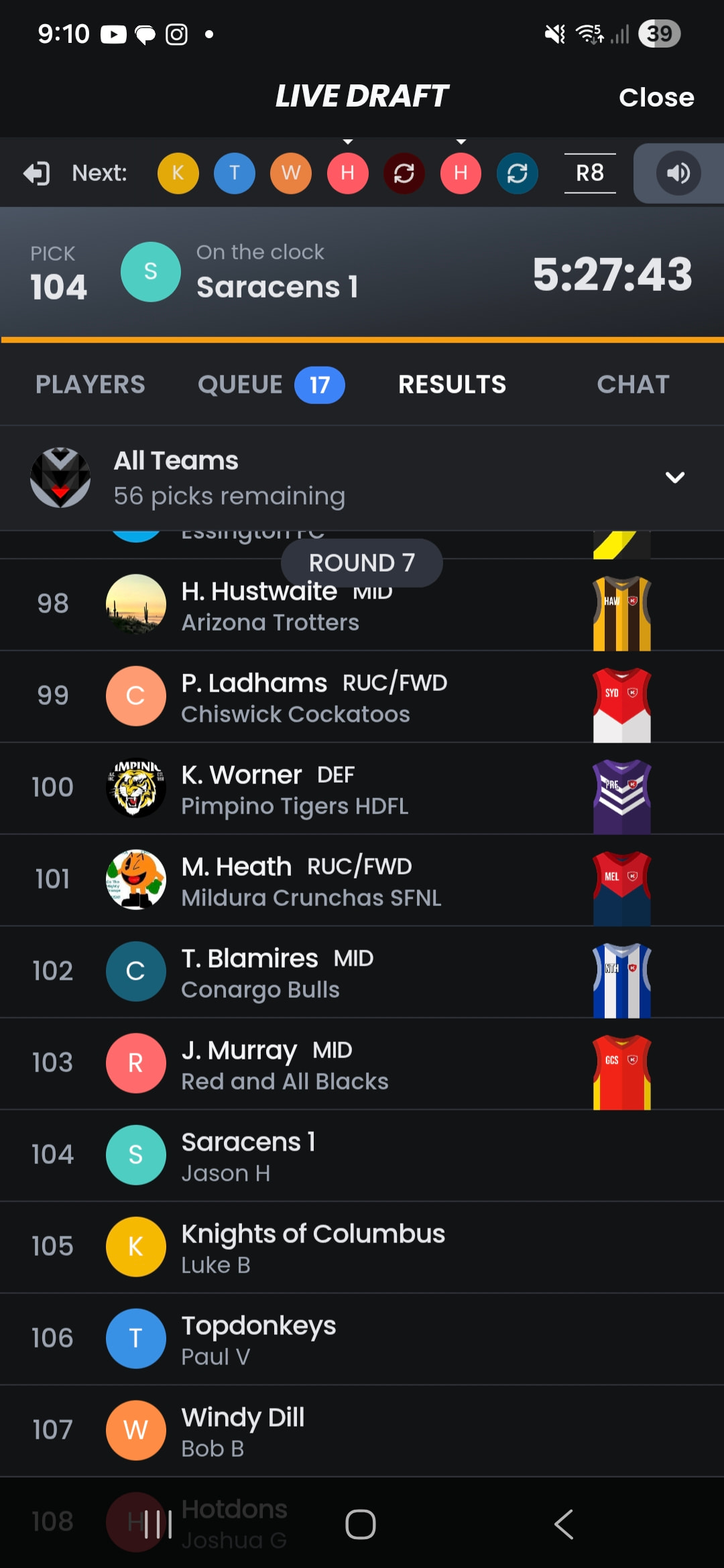 Hey RB, who did you pick it just says “a player” on my chat feed. On the draft board it just says “pick 102”, the picks either side of you have the names of the selected players.