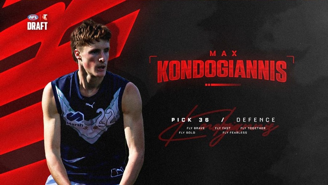 Essendon has pounced on 190cm talent Max Kondogiannis with pick No.36 in the 2025 Telstra AFL Draft.