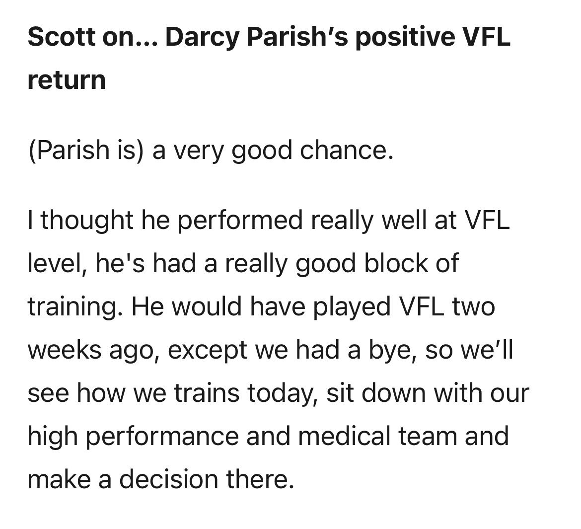 I just canât see a reason to rush him in. Id give him 2 more games in the VFL to give him confidence in his body.