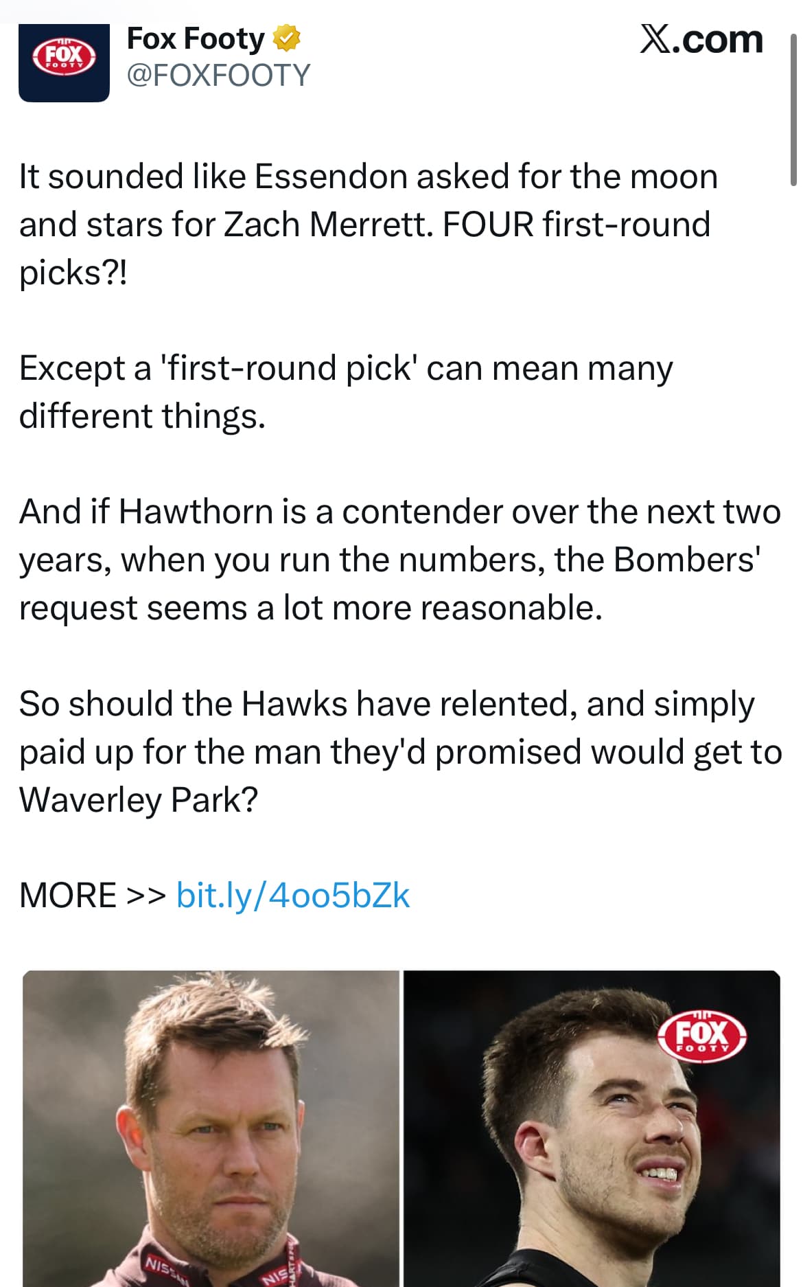 There is another possible explanation. In their arrogance they completely misread the potential outcome. Getting Merrett to go feral in public was their strategy. Their thinking was to make an atmosphere so toxic, that EFC would be only too willing to take unders just to get rid of Zach. Perhaps Welsh saw the flimsy plan for what it was and he is to be congratulated for calling the Dawksā bluff.