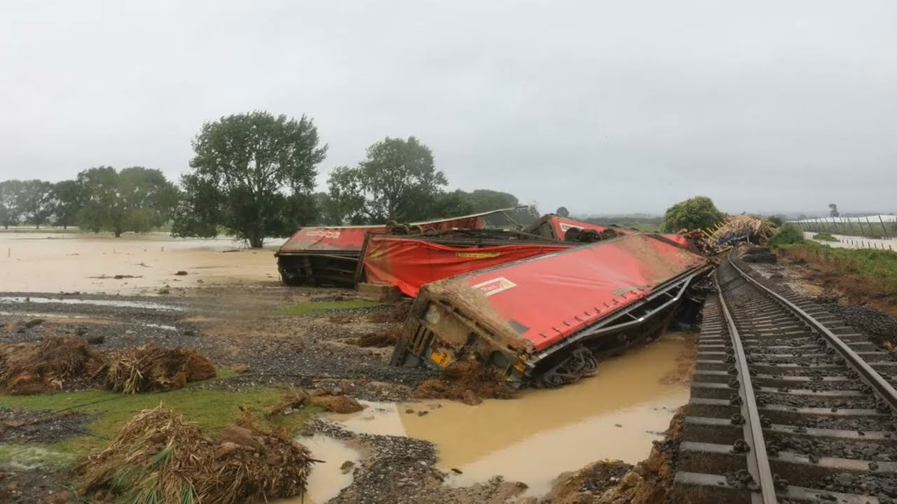 The flooding in NZ is pretty amazing. We just went for a drive around the local area and saw a derailed train (the track was completely washed away), 2 houses destroyed by a slip, kiwifruit vines completely underwater and a dead horse washed up in a flooded creek. All within 15kms of our house.