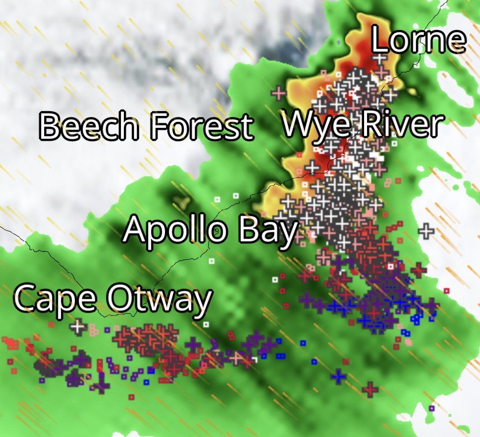 Looks like some really heavy precipitation happening on the Great Ocean Road at the moment, in a line coming directly off Bass Strait from Aireys Inlet down to Cape Otway.