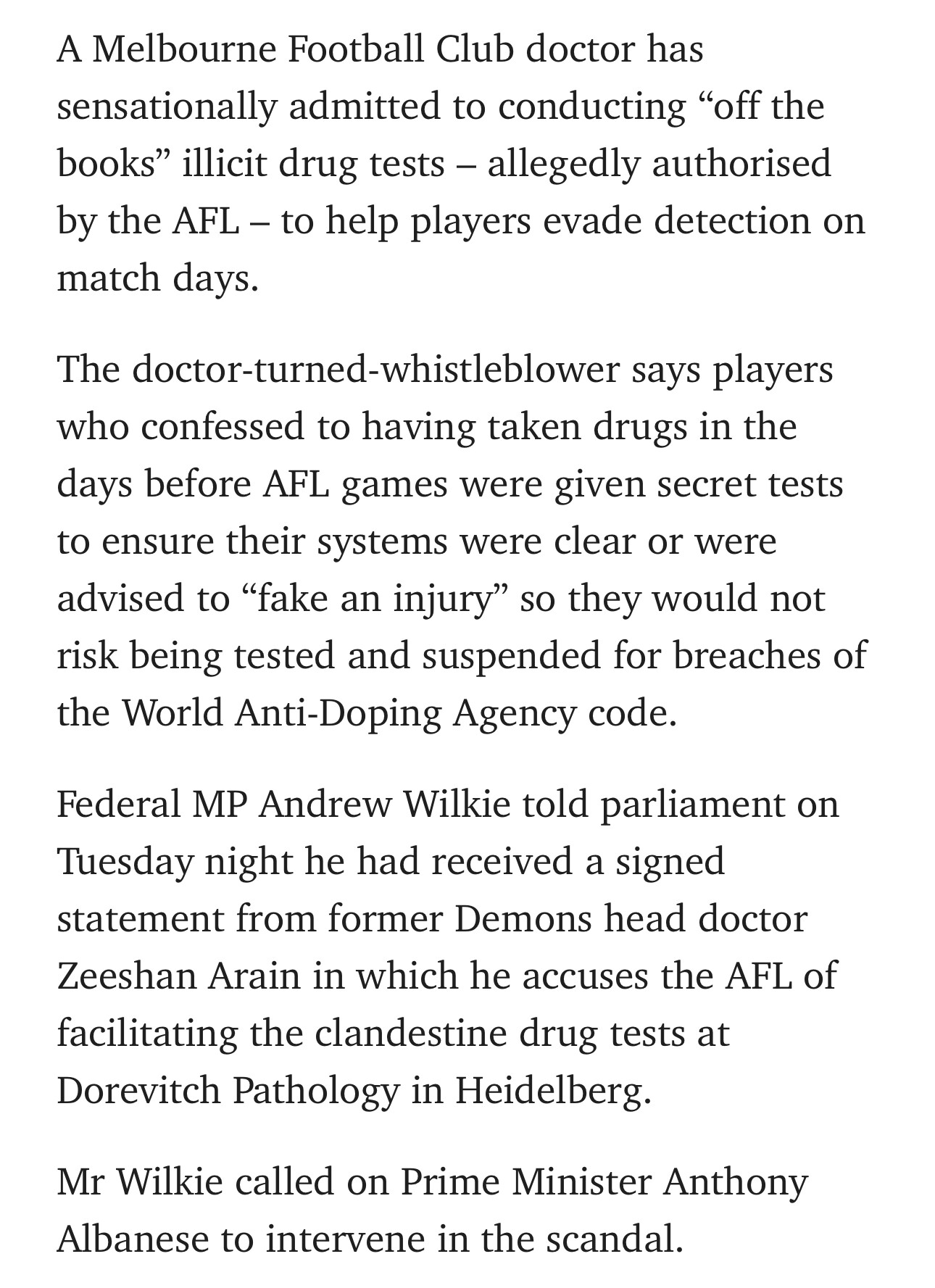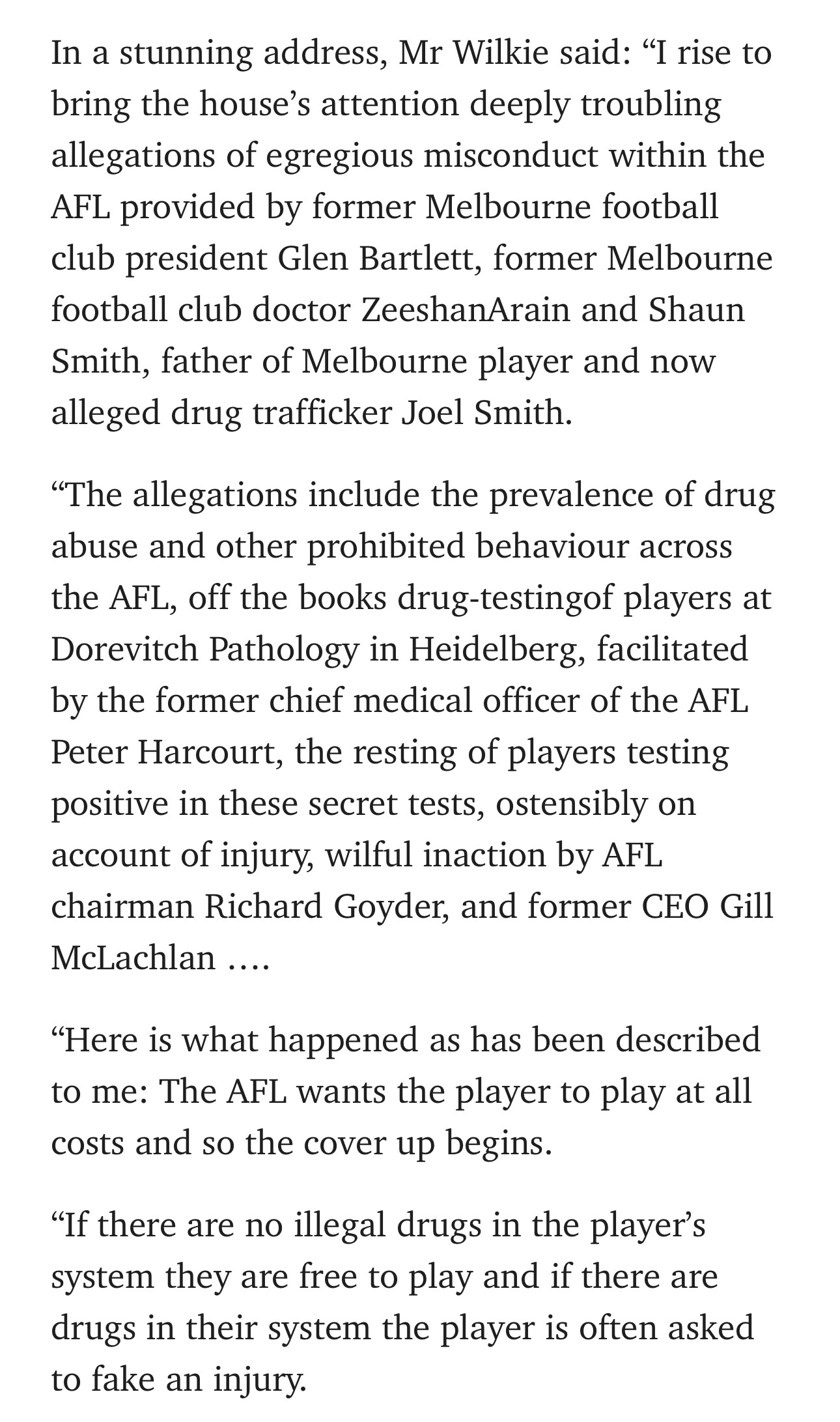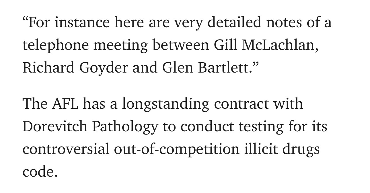 “The allegations include the prevalence of drug abuse and other prohibited behaviour across the AFL, off the books drug-testingof players at Dorevitch Pathology in Heidelberg, facilitated by the former chief medical officer of the AFL Peter Harcourt, the resting of players testing positive in these secret tests, ostensibly on account of injury, wilful inaction by AFL chairman Richard Goyder, and former CEO Gill McLachlan ….