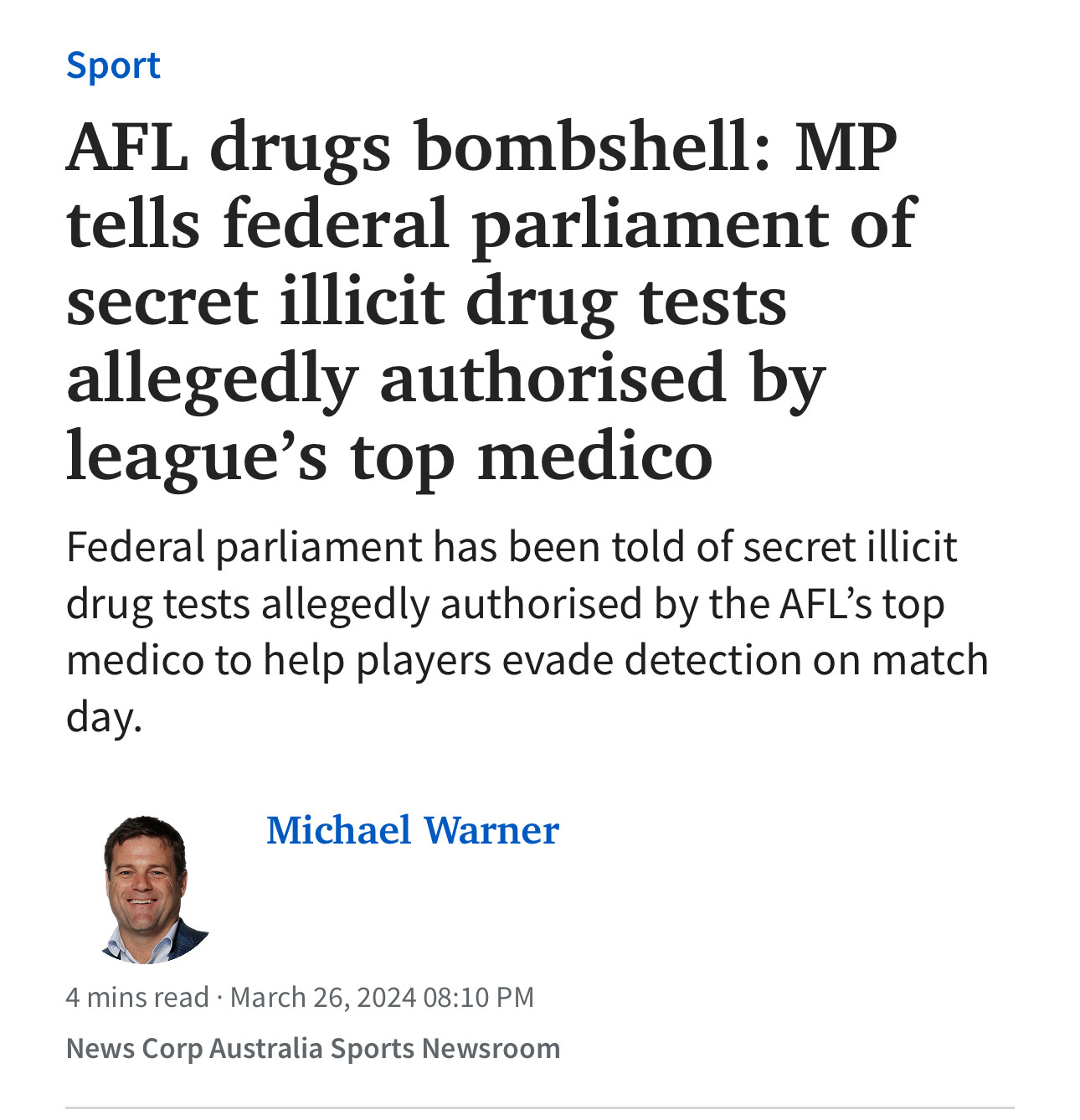 They did big breaking news segment on channel 7 news this morning. I think Melbourne will fall on the sword for this one. The AFL will investigate them and say they were using the tests in a manner that wasn’t intended.