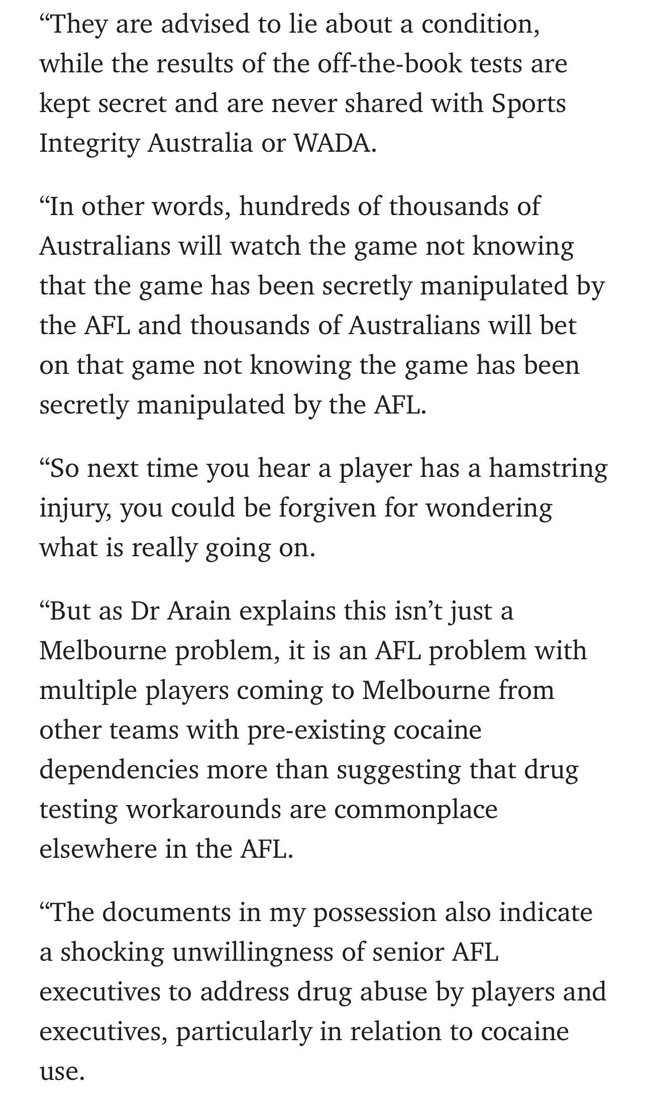 “But as Dr Arain explains this isn’t just a Melbourne problem, it is an AFL problem with multiple players coming to Melbourne from other teams with pre-existing cocaine dependencies more than suggesting that drug testing workarounds are commonplace elsewhere in the AFL.