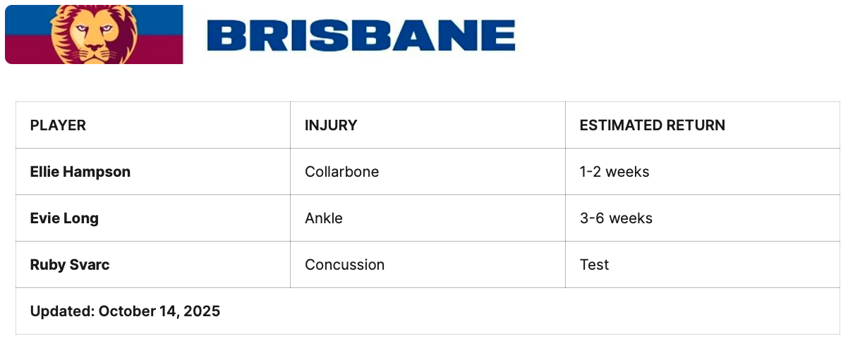 Bears captain Bre Koenen has been ruled out of the Lions’ clash with Essendon on Sunday due to injury though, but livewire ex-Bomber Ruby Svarc will return after a concussion that saw no punishment for the person who caused it (despite the AFL conceding the wrong decision had been made).