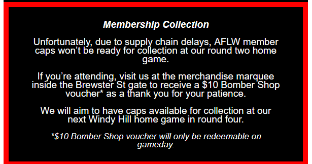 Unfortunately, due to supply chain delays, AFLW member caps wonât be ready for collection at our round two home game.