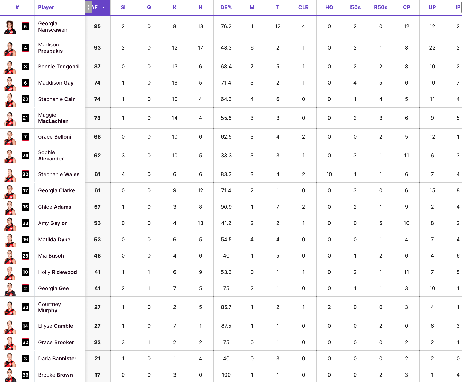 - Nanscawen 12 tackles, 4 ahead of a trio of Dees, and then Adams on 7. She also led our clearances.