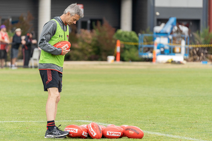 " I see what the problem is here! The footies at Richmond were all long and pointy, these ones here are all wide and flat. No wonder these clowns don’t know how to kick them properly."