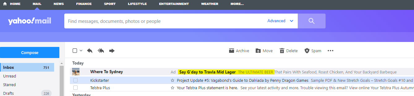 Apparently X’s marketing gurus have decided that the target market for Travla beer is … people who still use Yahoo Mail, and are directing their ad buys accordingly. THE ULTIMATE BEER, apparently.