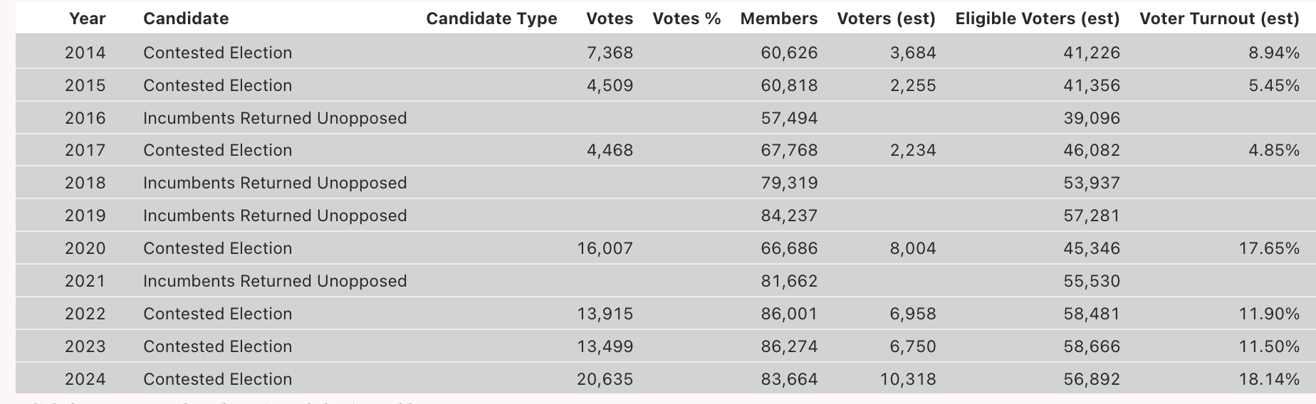 In my memory over many elections, somewhere between 5% and 8% of members vote. While total numbers of Votes cast may be around 15000 , Members get two votes as we are voting for two vacant spots.