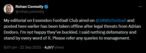So…apparently 3AW has pulled down Rohan’s rant after legal threats from none other than Dodoro. What a piece of work he is…