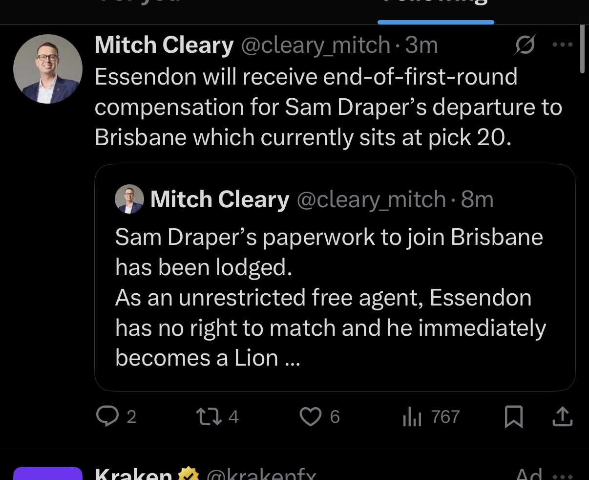 If he had been RFA we can match whatever Brisbane offer, no matter how big or the length of the contract.