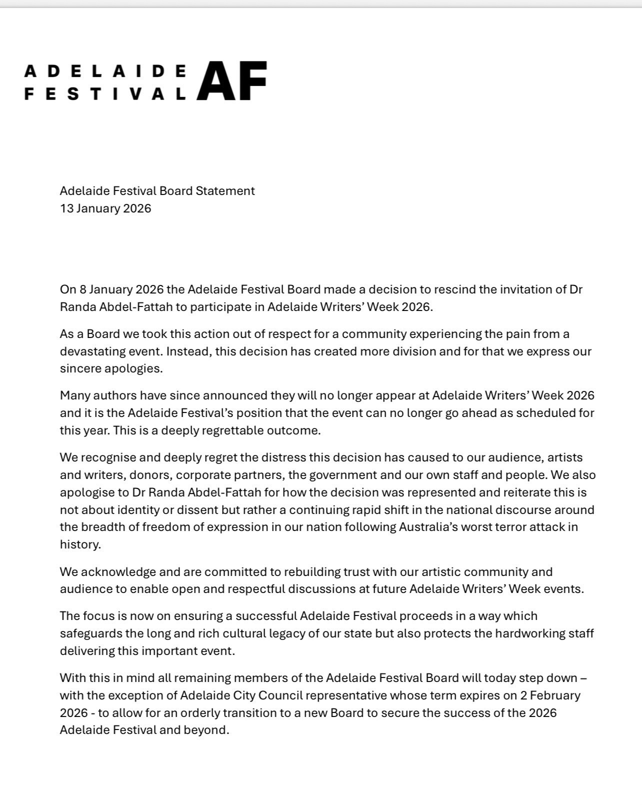 The writers week has been, apparently. The broader Adelaide festival will go on as usual, although in significantly gelded form.