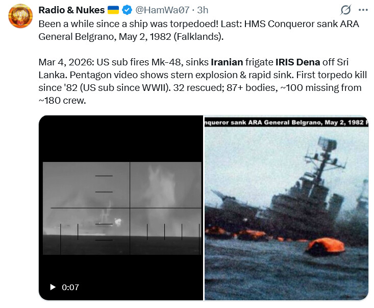 US sub sinks an Iranian frigate that had been in exercises with India, killing ~100. Sri Lanka respond to a distress call to rescue survivors and retrieve bodies.