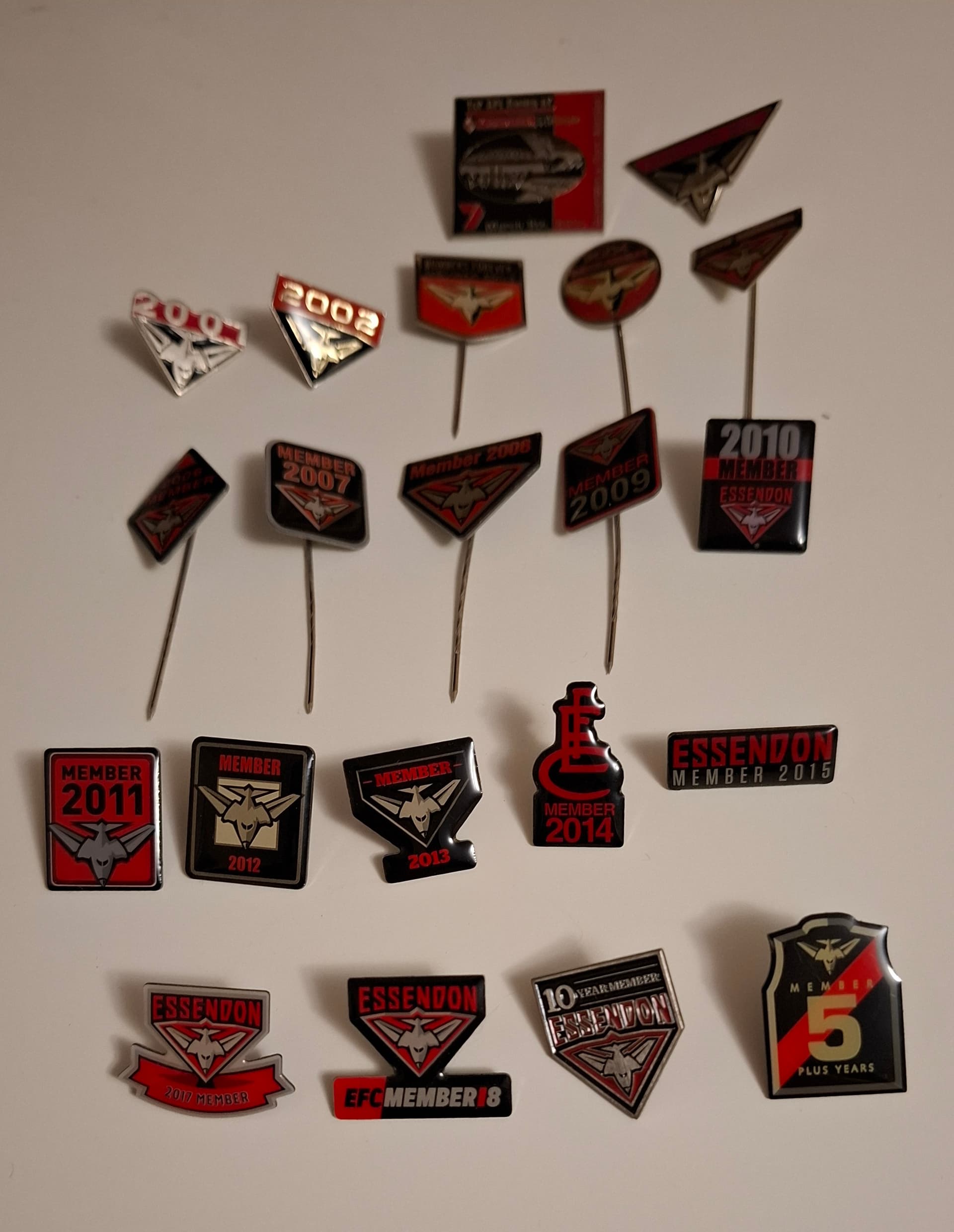 From 2000 through to 2018. With a 5 and 10 year membership pin, and one to “celebrate” the first game at Colonial Stadium. No idea where the 1993 to 1999 and post-2018 ones went/are.