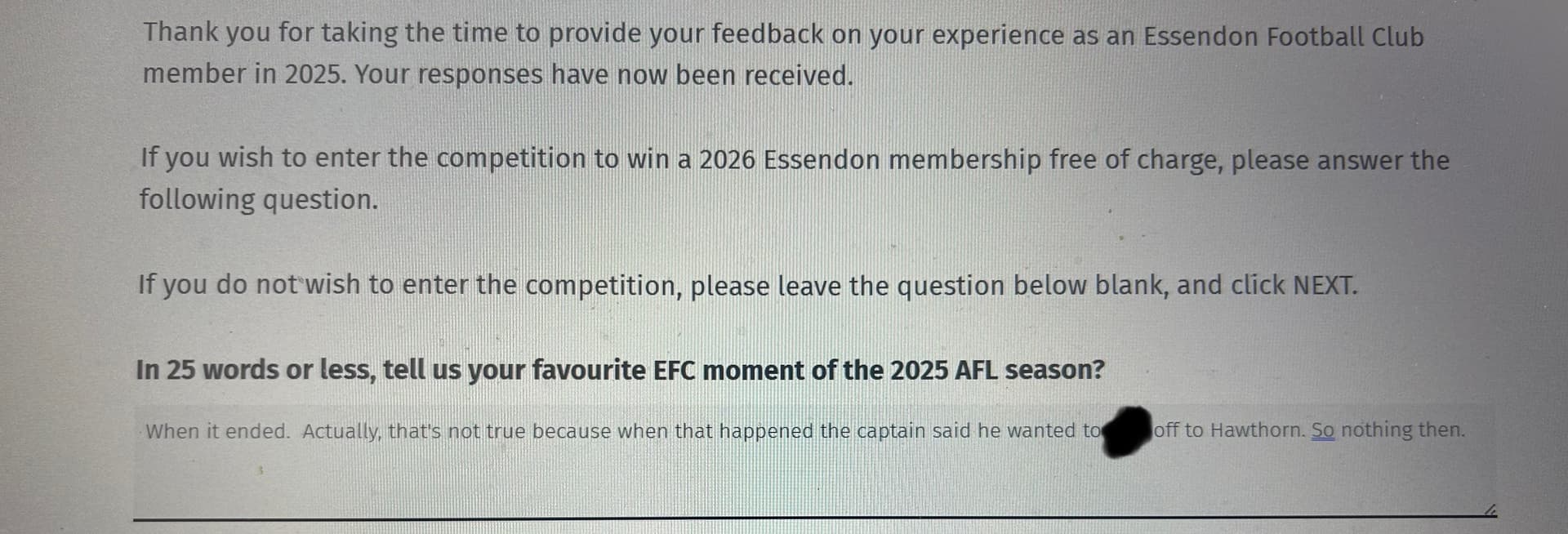 That one chance to drop a bucket on the club and point out their myriad sins, and feel a (misguided) sense that maybe you’re making an iota of difference somehow. Before the gloomy realisation that it will reach some lackey’s inbox and either a) progress no further than that, or b) get collated, sent on to someone vaguely powerful at the club and then be summarily ignored because we are Essendon…