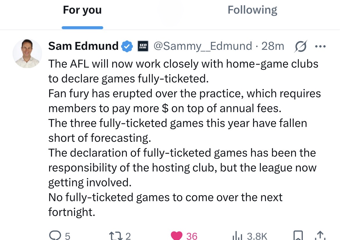 “The AFL Fans’ Association are going to ask Andrew Dillon for more detail about how you determine when a game is a fully ticketed match and we will then provide that information to fans.”