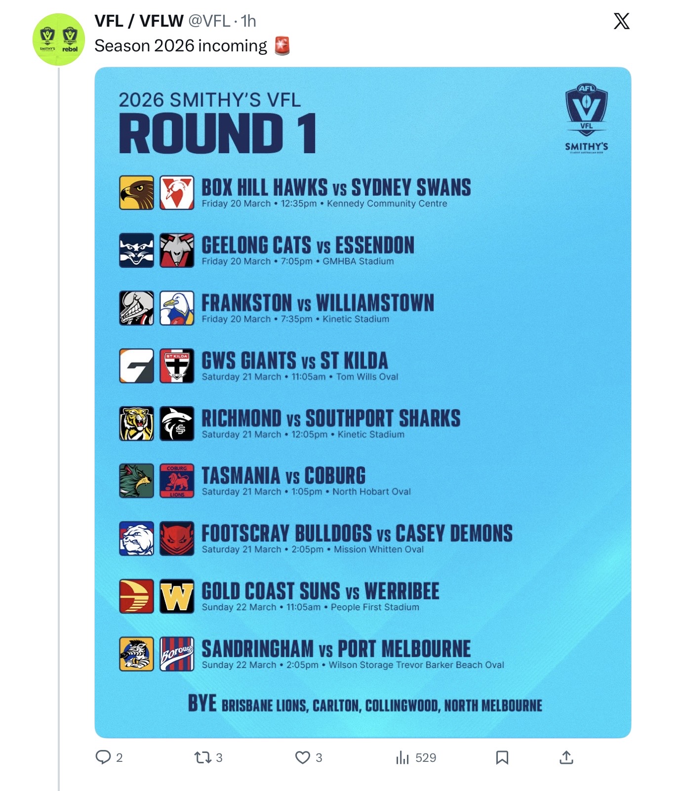 VFL spokesman Sam Zito said this afternoon: “Broadcast arrangements for season 2026 are currently not finalised and will be announced ahead of the season. However, we can confirm all VFL and VFLW matches will again be broadcast live and free via AFL channels.”