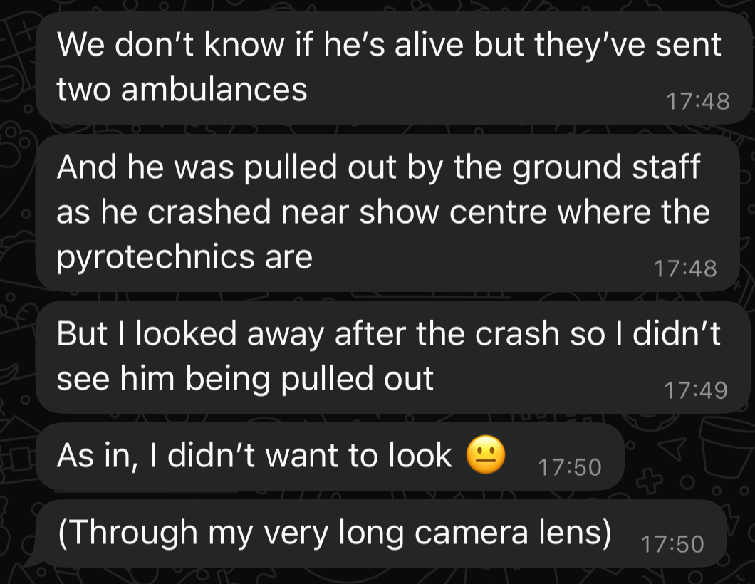 I had a free ticket for the airshow that day, but couldnât attend. Soooooo glad in hindsight that I missed that opportunity.