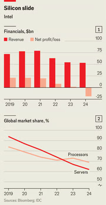 The company has missed nearly every big shift in its industry over the past two decades. It failed to profit from the rise of smartphones, was slow to adopt advanced lithography tools and has largely sat out the boom in artificial intelligence (AI). Between 2021 and 2024 revenue dropped by a third, from nearly $80bn to just over $50bn; last year it made a net loss of almost $20bn (see chart 1). Over the past five years its market value has fallen by roughly half, to around $100bn. TSMC, which has stolen Intel’s crown as the world’s leading chip manufacturer, is worth ten times as much.