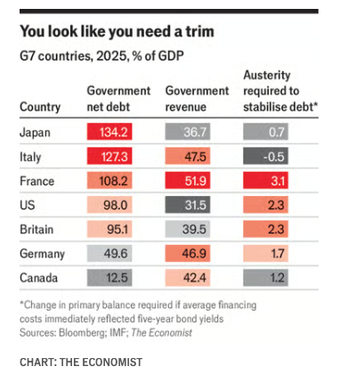 Unfortunately even modest budget targets are hard to hit if you start far away from them. In Britain and America, deficits are large. The belt-tightening needed to stabilise the debt-to-GDP ratio exceeds 2% of GDP; in France it is greater than 3% of GDP. Another problem in Europe is that taxes are high as a share of GDP, limiting the scope to raise them without doing excessive economic damage. Of the G7 group of big rich economies only Canada enjoys low debt, a small necessary adjustment and the space to raise taxes. France looks bad by all three measures. Things look worse still when you consider the coming wave of spending on ageing populations, defence and the climate transition.