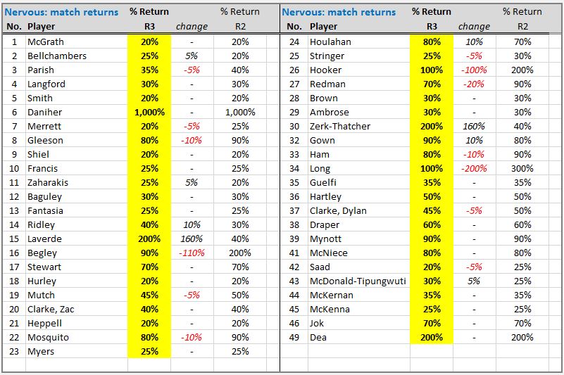 Anyway, I’m sticking with Mitch Brown as a hard working tall forward, even though his scoreboard impact has been poor.