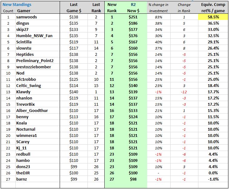Also you are not out of the season - the game is designed to allow Gamers to move up from the bottom, and not be overly penalised by one bad decision. That is why all the payments increase through the year, and some payments go more to Gamers at the bottom.