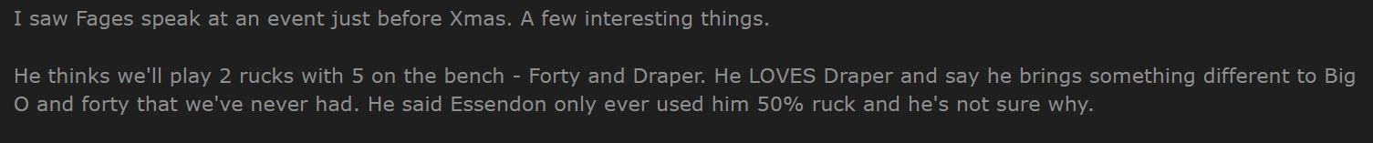 I suspect they’ll be aiming to have Draper average 65-70 ruck contests per game instead of the sort of 50-55 per game he was averaging at Essendon.