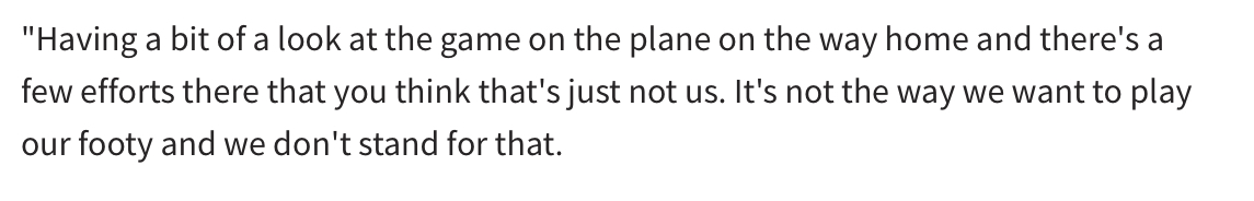 "Having a bit of a look at the game on the plane on the way home and there’s a few efforts there that you think that’s just not us. It’s not the way we want to play our footy and we don’t stand for that.