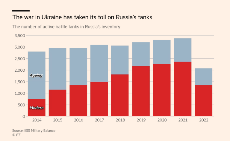 Of those, Russia has lost up to 2,300 tanks in Ukraine, including about half of its most modern battle tanks, according to a report last week by the International Institute for Strategic Studies. Though Russia is currently deploying about 1,800 tanks and has a further 5,000 in reserve, many of them are Soviet-era tanks often in poor condition, the report says.