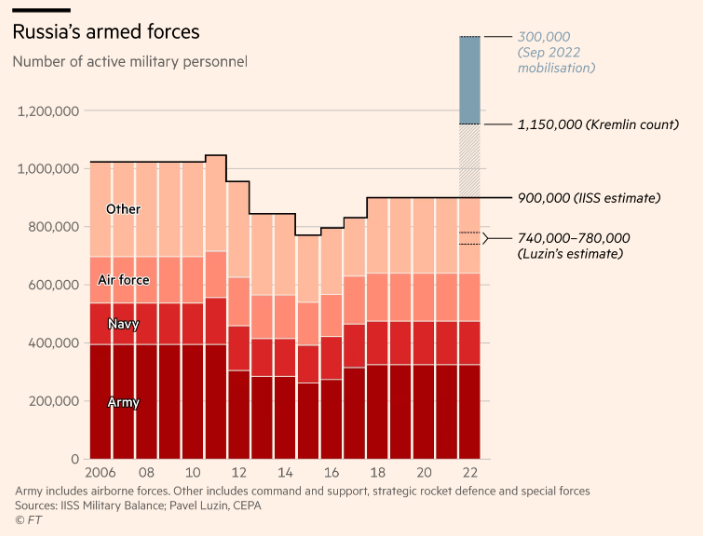 Before the start of the war, Russia’s army totalled between 740,000 and 780,000 personnel according to Luzin, the military expert from Tufts University — far fewer than the official figure of 1.15mn. Moreover, only up to 168,000 troops were permanently combat ready troops in battalion tactical groups, while 100,000 or so were in units that served as their reserves, according to Luzin. The rest were support personnel.