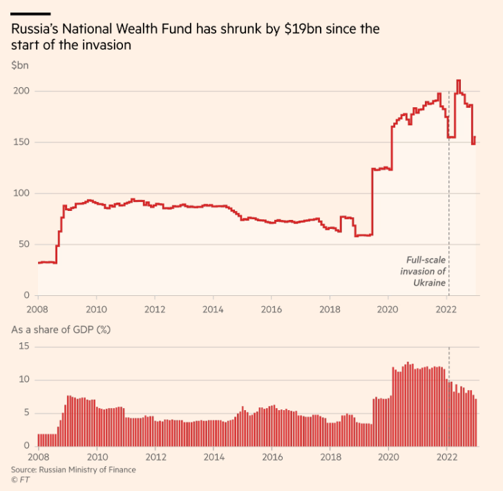 The assets controlled by Russia’s National Wealth Fund (NWF) grew from 1.9 per cent of GDP in 2008 to 10.2 per cent by the beginning of the invasion. A year later, it is down to 7.2 per cent of GDP — due to currency revaluation and the state using its assets to cover the deficit. In 2023, the budget law projects a deficit of Rbs2.9tn, equivalent to 1.9 per cent of GDP, much of which the state plans to cover with NWF money.
