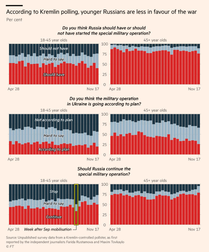 The Kremlin is also tracking those trends closely. In a secret poll conducted by a Kremlin-controlled polling agency in November, 60 per cent of Russians said Putin had done the right thing by starting the war — a 10 per cent drop since the spring.