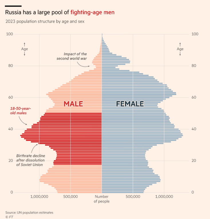 There are indeed about 30mn men of fighting age, 18-50, in Russia, but in that group only 9mn-10mn have military experience, primarily due to conscription, according to researcher and demographics specialist Igor Efremov.