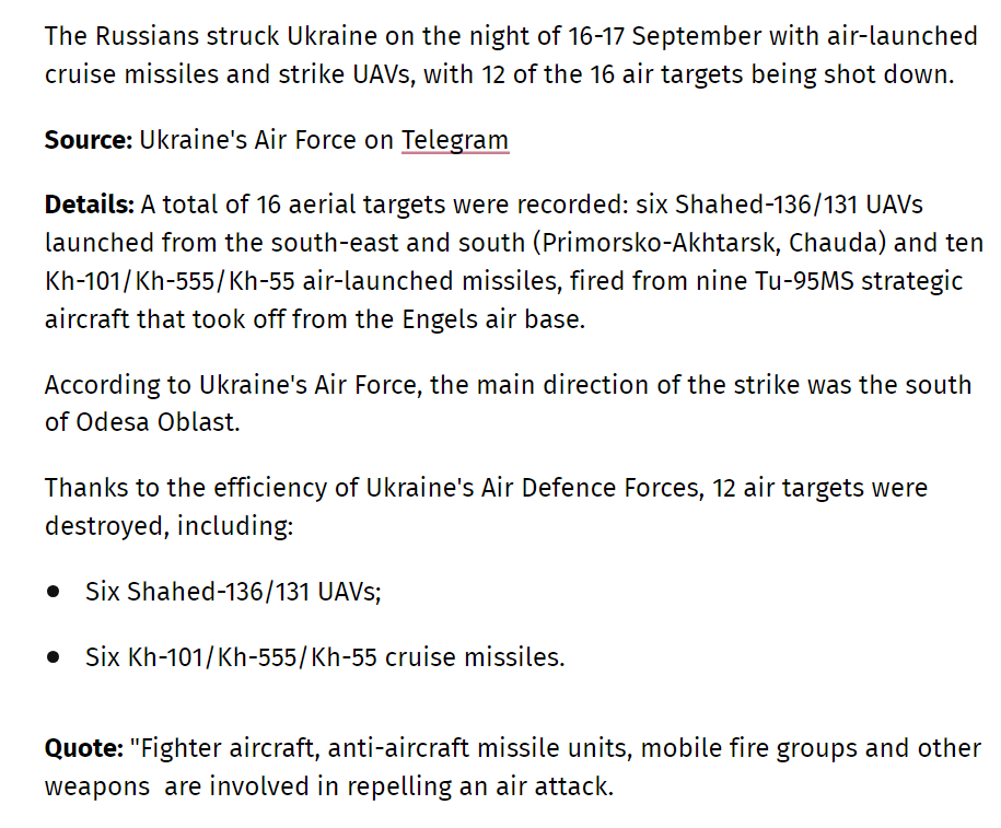 Russia launched a big drone and missile attack overnight. A total of 18 out of 24 Shahed drones were destroyed aimed for Odesa and Mykolaiv. Additionally, all 17 Kh-55/101/555 type cruise missiles were shot down.