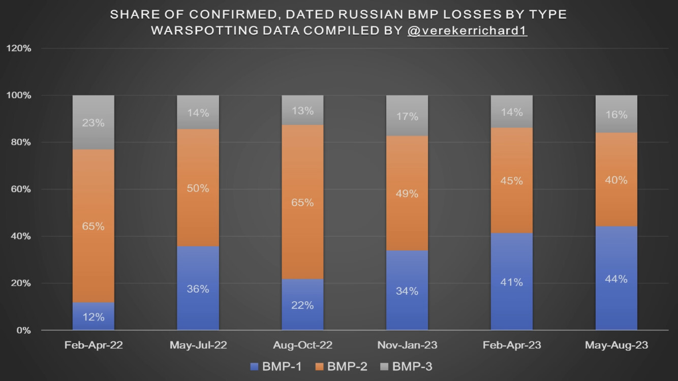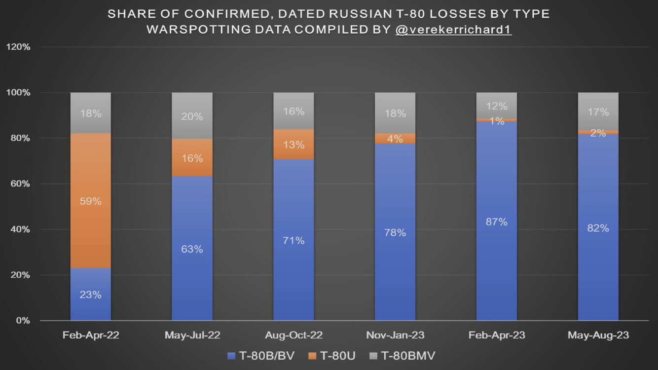 Loss data. Junk unupgraded T-80s now almost all of the fleet, with the upgraded BVM models flowing in at a fraction of the loss rate, enough to maintain numbers. The middle tier T-80Us are all dead.