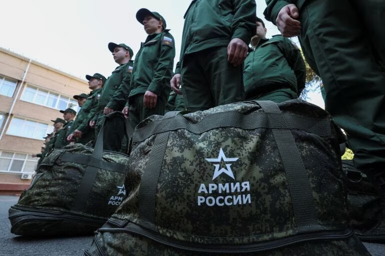 Russian conscripts called up for military service line up before their departure for garrisons as they gather at a recruitment centre in Simferopol, Crimea, April 25, 2023. The signs on the bags read: ‘Army of Russia’ [Alexey Pavlishak/Reuters]