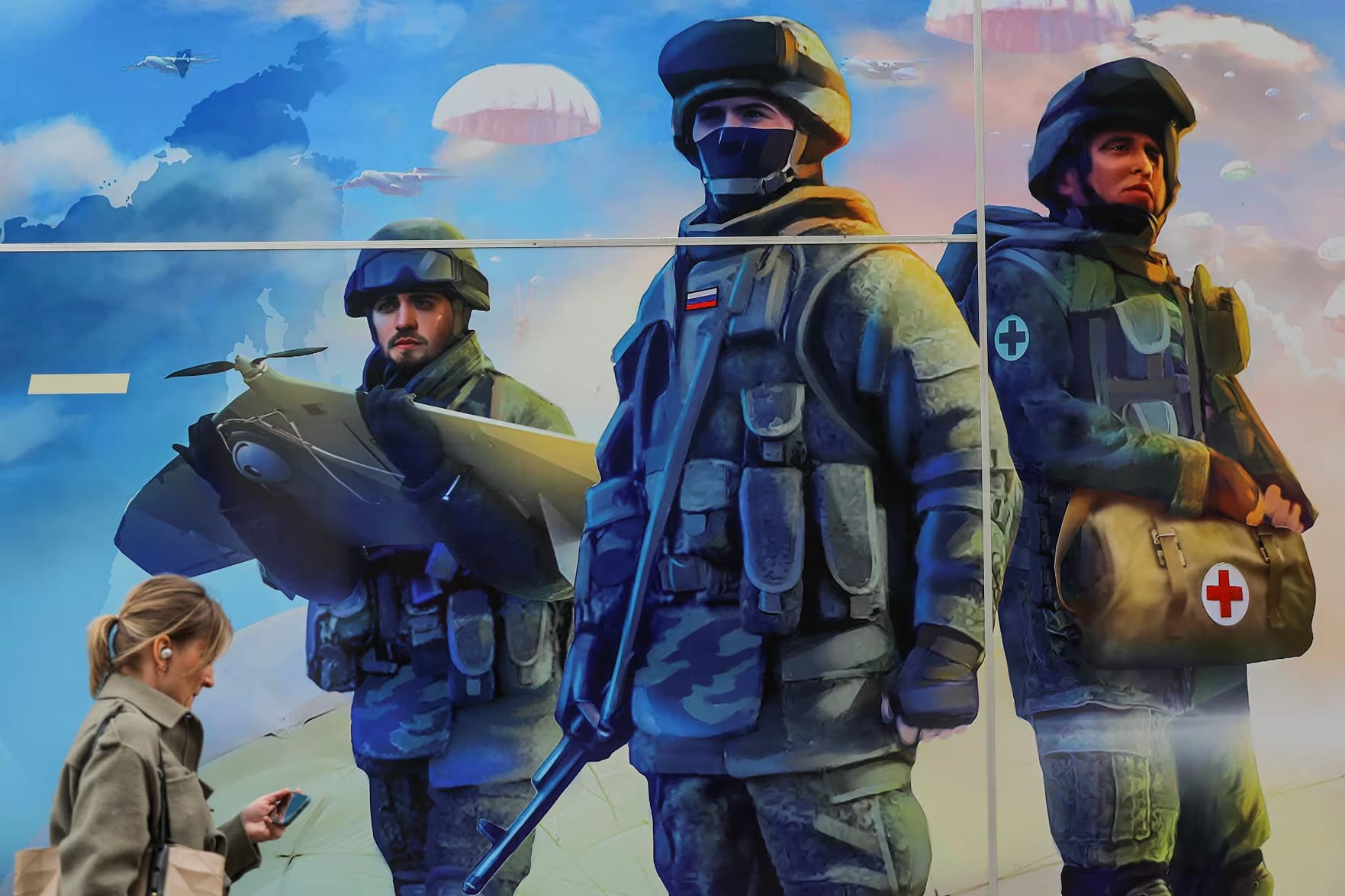 A pedestrian walks past a mobile recruitment point promoting service in the Russian army and inviting volunteers to sign a contract with the defence ministry, in a street in Moscow, Russia, May 3, 2023 [Evgenia Novozhenina/Reuters]