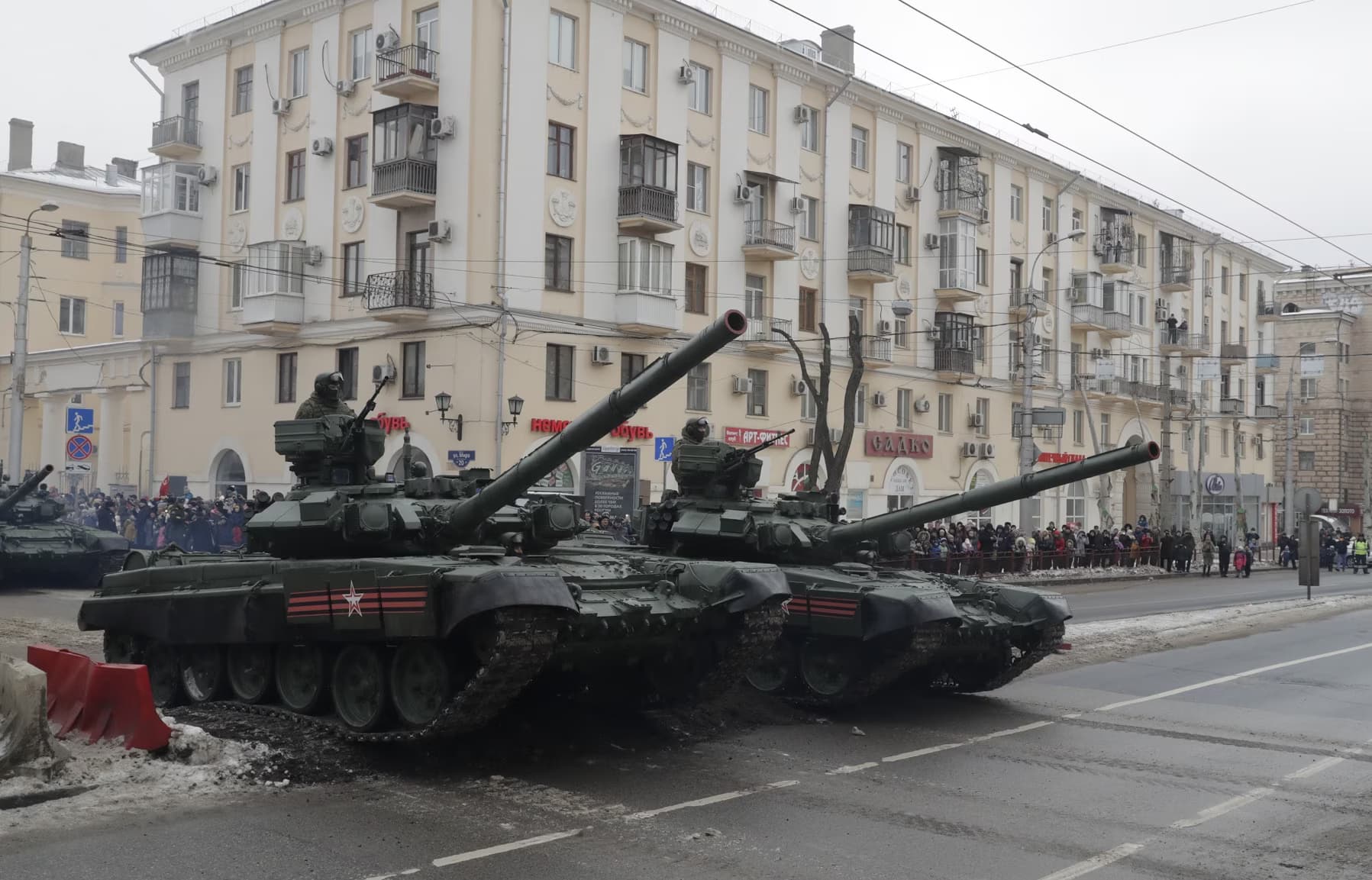 Russian T-90 tanks drive during the military parade to commemorate the 75th anniversary of the battle of Stalingrad in World War Two, in the city of Volgograd, Russia, February 2, 2018 [File: Tatyana Maleyeva/Reuters]