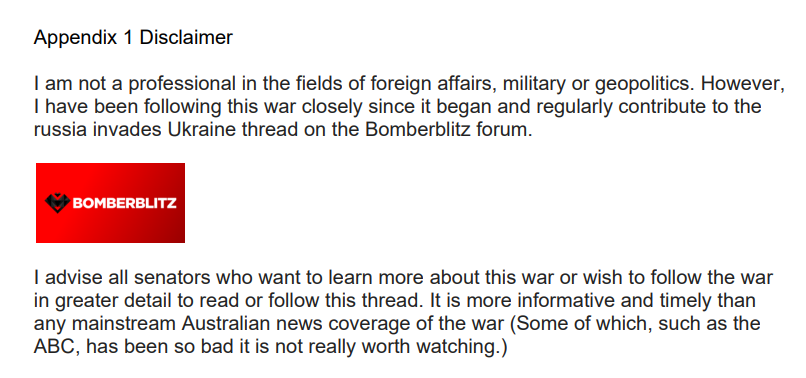 What is funnier is that I procrastinated and so left writing my submission until the last day (they subsequently extended the deadline) so I ended up copy and pasting most of Mick Ryan’s recommendations. I was scathing of the ABC coverage of the Ukraine war and advised the Australian Senate to follow this thread (with link) to keep up to date with what was going on in the war: