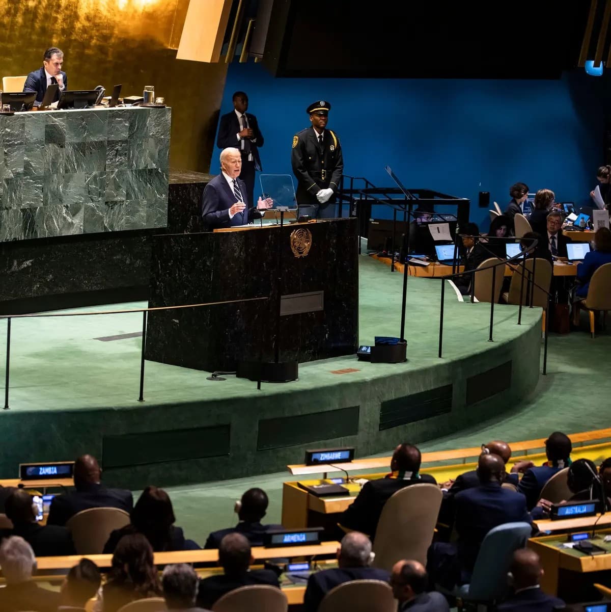 In speeches and closed-door talks, most recently at the United Nations General Assembly in New York, U.S. officials have been sounding the alarm on the coalition of powers working to strengthen one another’s militaries to defeat America’s partners.Credit…Dave Sanders for The New York Times