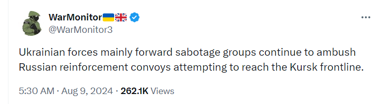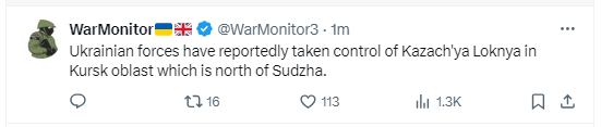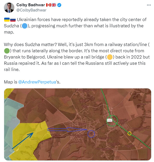 In its latest report, the Institute for the Study of War, a well-respected think tank, said geolocated footage from the past two days showed that Ukrainian armoured vehicles have advanced to positions 10km (6.2 miles) into the Kursk region.