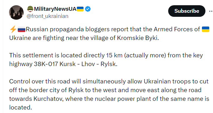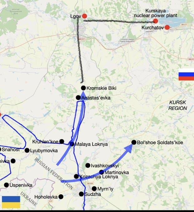 Russian military bloggers claimed Ukrainian forces had occupied several border villages and part of the town of Sudzha.