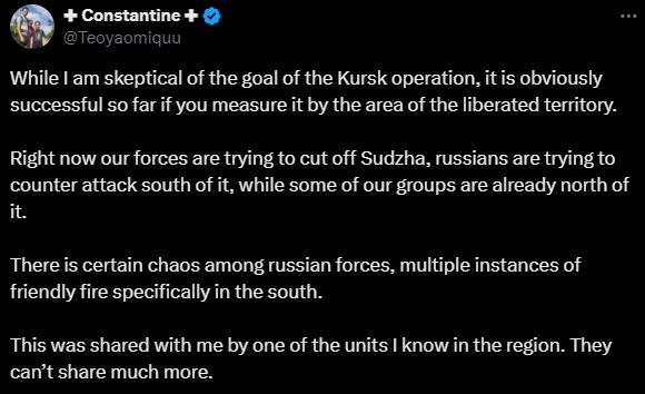 But Russian military bloggers painted a drastically different picture, criticizing Russian forces for not better fortifying the border and lamenting the town of Sudzha as lost to the surprise Ukrainian invaders now turning the tables on their occupiers.