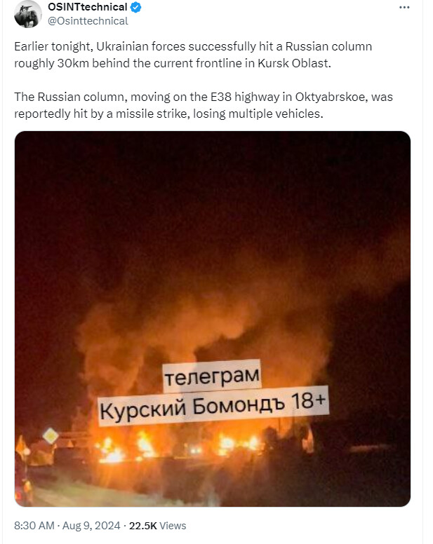 There is no doubt in my mind that this move by UA has been a PR coup and a huge propaganda boost. It will have lifted spirits at home by taking the fight to the invaders. Can this advance be sustained? That is highly doubtful. I suspect a couple of different strategies are possible here. In order to take pressure off other sectors of the front line the RU have to see this advance as a threat in some way. If they move a lot more troops in to repel the incursion, UA can and should fall back. If the RUAF donât respond then UAAF can advance even further to put more pressure on the RUAF to respond. Given the lack of organization on the RU side, a response could be slow in coming and lack the necessary force to expel UA forces.