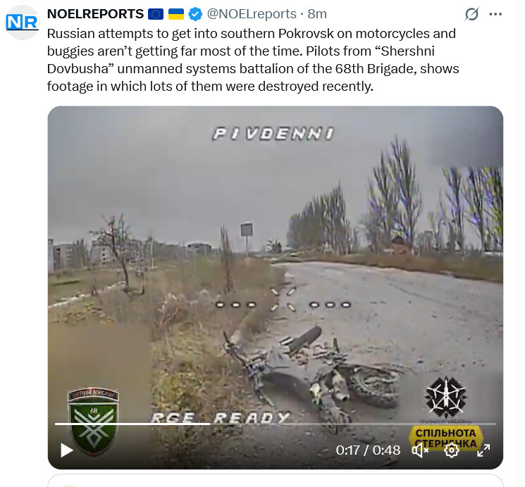 General Staff spokesman Andriy Kovaľov did not say exactly what the aforementioned supply problems mean, but he denied claims that Russian troops have full fire control over Ukrainian supply routes. New ammunition was delivered to the units in Myrnohrad on Sunday and the wounded were evacuated, he specified. According to him, Ukrainian troops continue to fight against Russian forces in Pokrovsk.”…